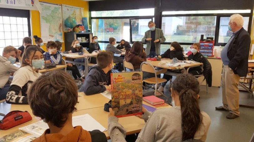 Jacques-Henry répond aux questions des élèves : comment la VMS a travaillé après la remise de leurs textes, le comité de relecture, la recherche de quelques illustrations complémentaires, la mise en pages etc